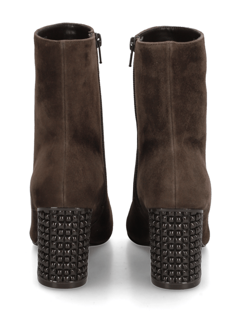 Die elegante Kate Gray Stiefelette aus feinem braunen Veloursleder vereint zeitlose Schlichtheit mit einem besonderen Highlight: dem markant verzierten Blockabsatz, der dem Modell eine moderne, extravagante Note verleiht. Dank des seitlichen Reißverschlusses lässt sich die Stiefelette bequem an- und ausziehen, während die hochwertige Verarbeitung für besten Tragekomfort sorgt. Ein stilvoller Begleiter für Office-Looks, elegante Outfits und trendige City-Styles.