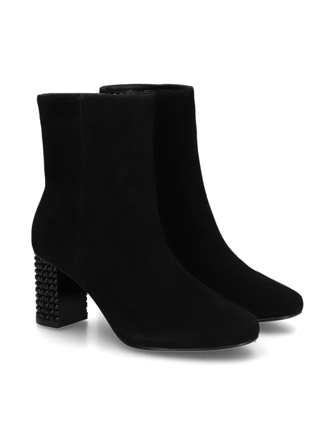 Die elegante Kate Gray Stiefelette aus feinem schwarzen Veloursleder vereint zeitlose Schlichtheit mit einem besonderen Highlight: dem markant verzierten Blockabsatz, der dem Modell eine moderne, extravagante Note verleiht. Dank des seitlichen Reißverschlusses lässt sich die Stiefelette bequem an- und ausziehen, während die hochwertige Verarbeitung für besten Tragekomfort sorgt. Ein stilvoller Begleiter für Office-Looks, elegante Outfits und trendige City-Styles.
