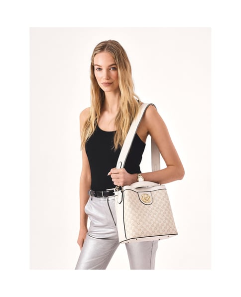 Die Tasche aus hochwertigem Naturleder in einem eleganten gebrochenen Weiß ist mit einem dezenten beigen KAZAR Monogramm-Muster verziert, das ihr einen raffinierten und luxuriösen Touch verleiht. Details wie ein abnehmbarer Griff und ein breiter Riemen sorgen für Vielseitigkeit - sie kann je nach Anlass in der Hand oder über der Schulter getragen werden. Das Innere der Tasche verfügt über drei geräumige Fächer, in denen sich Gegenstände leicht organisieren und aufbewahren lassen. Die Metallfüße auf dem Boden schützen den Boden der Tasche vor Beschädigungen und verleihen ihr gleichzeitig Eleganz und Funktionalität. Sie ist das perfekte Accessoire sowohl für den Alltag als auch für formelle Anlässe.Einzelheiten zum Produkt:Die Tasche hat 3 Fächer: 2 mit Magnetverschluss und 1 mit Reißverschluss.Das Fach hat 1 Reißverschlussfach.Die Handtasche hat einen abnehmbaren, nicht verstellbaren Riemen.Der Griff ist abnehmbar.An der Unterseite der Tasche befinden sich Metallfüße.