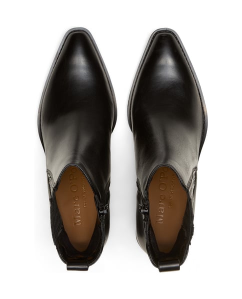 Smart und ausdrucksstark: die hochwertige Stiefelette im Western-Stil überzeugt mit edlem Rindleder und markanten Details wie dem charakteristischen, abgeschrägten Absatz und der spitz zulaufenden Kappe. Der praktische Innenreißverschluss, der dezente Elastikeinsatz und die robuste Lederlasche an der Ferse sorgen für müheloses An- und Ausziehen. Innen sorgt ein weiches Futter aus recycelter Mikrofaser und eine Memory-Foam-Innensohle aus Kalbleder für Komfort. Die strapazierfähige TR-Laufsohle bietet zuverlässige Rutschfestigkeit und lange Haltbarkeit – perfekt für einen stilvollen und komfortablen Auftritt.