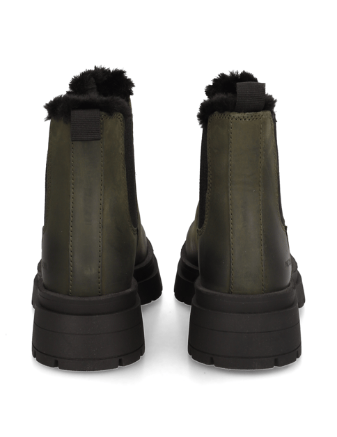 Dieser Chelsea Boot in dunklem Moosgrün ist aus feinem Glattleder gefertigt, das ihm einen cleanen Casual Look verleiht. Das warme Innenfutter sorgt für ein angenehmes Tragegefühl und macht ihn zum perfekten Begleiter an kalten Herbst- aber auch bereits Wintertagen. Zudem vermittelt das angenehm warme Futter, das auf der Höhe des Schaftes etwas herausragt, sofort ein wohlig warmes Gefühl. Die kompakte Sohle bietet eine gute Schritt-Dämpfung und ist zudem rutschfest. So ist die Trägerin auch auf glatten Böden sicher unterwegs. Der Lederloop am Schaftrand unterstützt beim leichten Einstieg in den Boot und ist zudem ein lässiges und typisches Detail eines Chelseas. Das trifft auch auf den Elastik-Einsatz zu, der dem Boot durch seine grobe Strukturierung einen modischen Touch verleiht. Der in Portugal hergestellte Chelsea Boot ist stilvoll und zugleich vielseitig. Unzählige Kombinationsmöglichkeiten machen das Styling mit dem neuen Lieblingsstück zum Vergnügen. Besonders lässig wirkt er zu einem Strickrock, der bis über das Knie reicht und zu gemusterten kurzen Strickpullis – ein perfekter Gesamtlook für die Herbstsaison.