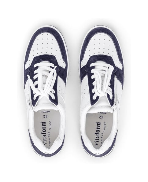 Für welche Farbe werden Sie sich entscheiden? Für den weißen cleanen Sneaker, der durch die farblich abgesetzte Ferse mit dem VITAFORM Kürzel den Ton angibt. Oder für das Modell in weiß-marine, das mit dem Farbakzent an Laufsohle, im Bereich rund um die Schnürung, vorne und an der Ferse für einen Hingucker sorgt. Was auch immer Ihr Typ ist: Style und Komfort sind einfach top. Das liegt natürlich am Reißverschluss, der das Schnüren überflüssig macht und das An- und Ausziehen zur Sekundenfrage. Auch die inneren Werte können sich sehen lassen: so etwa das austauschbare Komfortfußbett mit extra Polsterung und Bezug aus echtem, chromfreien Leder. Viel Freude beim Herumsneakern!